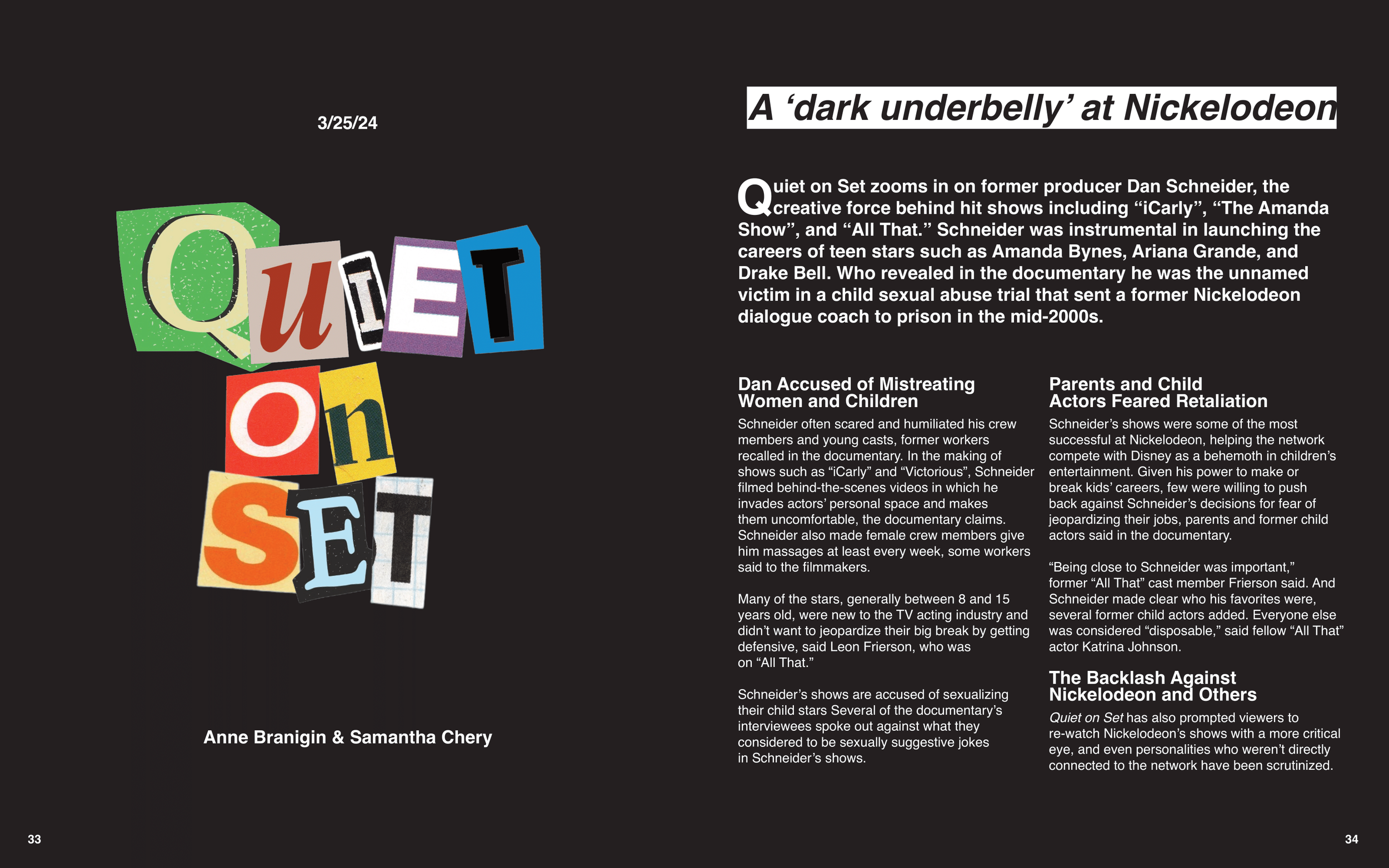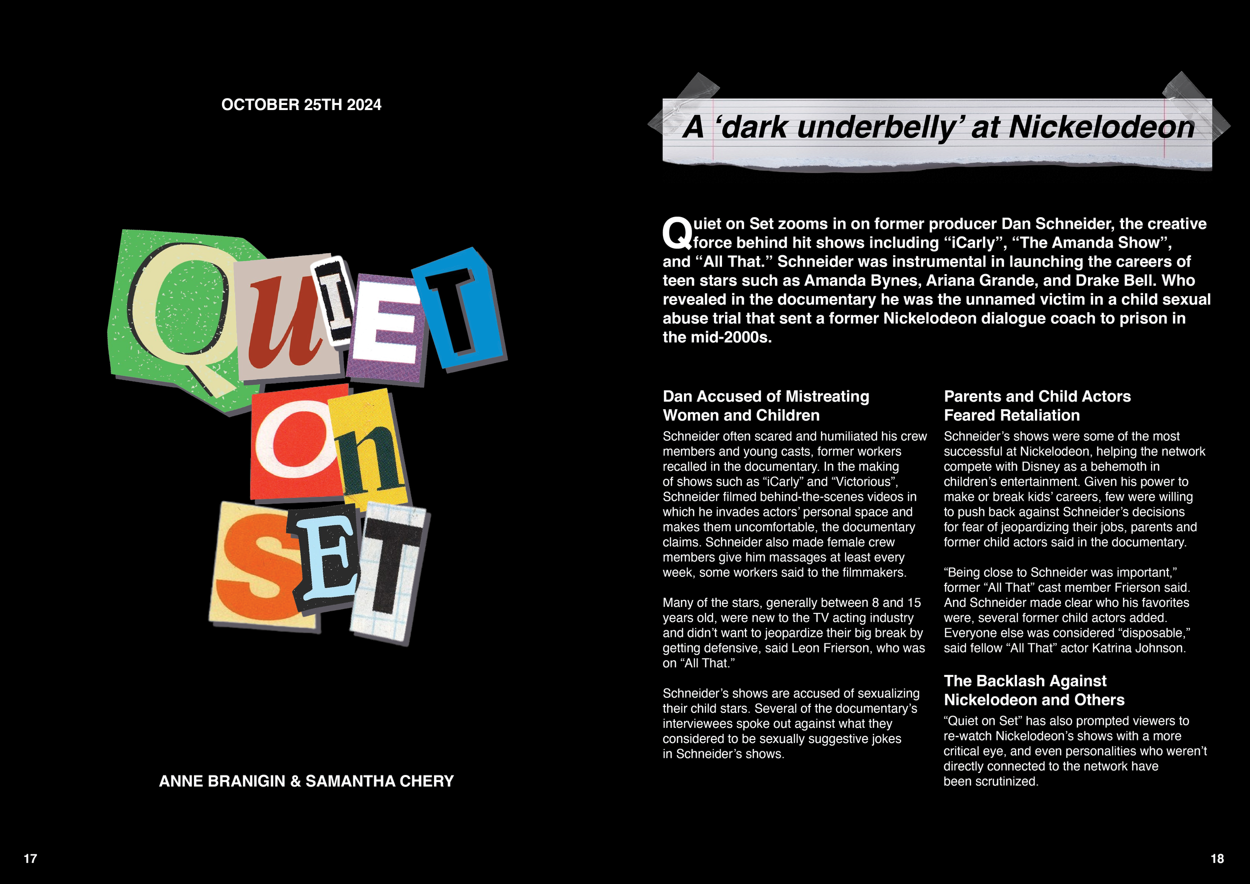 Tasked with designing a two-page magazine spread for an article of my choice. After watching Quiet On Set, I knew immediately that I wanted to base my design on it. I aimed for a dark and ominous atmosphere to match the heavy, somber tone of the article.
